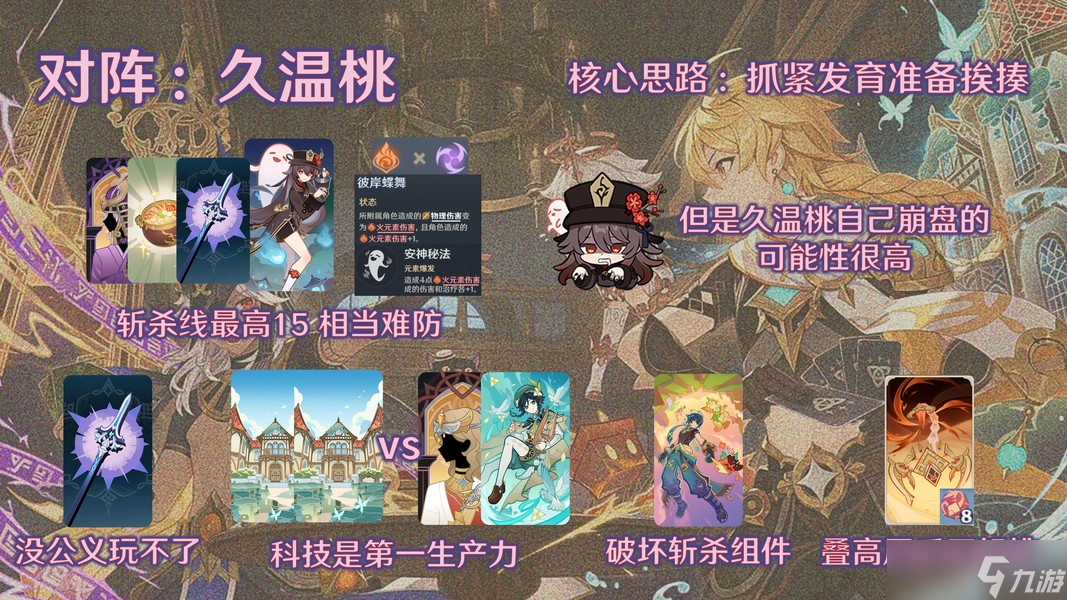 面对久温桃,主克希完全没有在前期击倒12血胡桃的可能性,胜负主要取决于对手公义的酬报是否来得早,以及双方科技上的差距,主克希能做的只有抓紧时间发育准备挨揍。通常来说,在公义早来的情况下,久温桃这边几乎可以保证每回合攒出一个元素爆发,甚至有些构筑还有黄金剧团温迪辅助逛街,只要交一个元素爆发击倒主母,再给克洛琳德扩上雷或是来一个元素爆发,克洛琳德基本上就来不及奶回来了。主克希这边要注意尽快找到两张晨曦酒庄,形成科技优势,逛街规避对手斩杀,以极限之名大量消耗对手资源,慢慢堆叠主母特技层数,一旦拖到对局后期特技层数来到7以上,就能够逆转局势,靠战技挂雷接特技反杀胡桃。