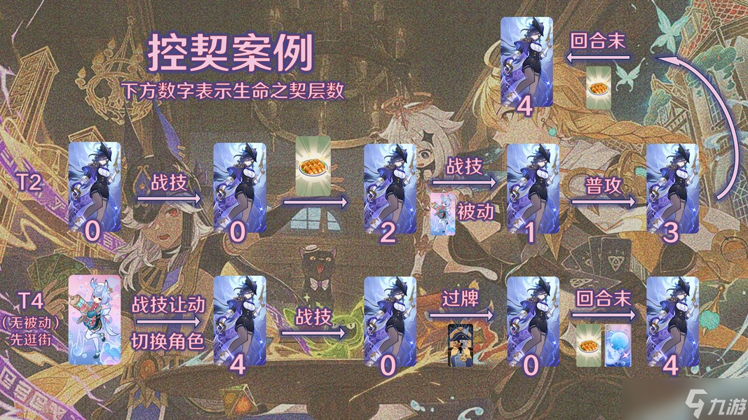 例如,克洛琳德T2先战技,再打出松茸酿肉卷叠2层契,战技消契触发希格雯被动给1层契,再普攻叠到3层契,回合末触发松茸酿肉卷治疗叠满4层契;经过一番操作触发完毕3次希格雯被动后,T4先反复逛街和对手互相消耗骰子,到希格雯战技让一动,切克洛琳德战技消契,触发逐影猎人回骰,挨打触发逐影猎人过1张牌,回合结束时依靠松茸酿肉卷治疗与必定抽到的希格雯水泡直接从0层契叠满4层契。