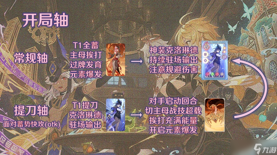 另一种开局轴是暂时放弃积攒主母特技,直接出战克洛琳德提刀开始输出。在面对和璞鸢云堇、突角龙胡桃这一类前期几乎不进攻的纯otk牌组时,主母极难通过挨打自动充满能量。即使侥幸拿到特技,对手在一回合内的集中爆发输出也不会给炎之魔蝎积累太多层数,因此在这一类对局中,应该考虑暂时放弃特技让克洛琳德直接提刀开始输出,尽快灌伤害压低对手状态的同时积攒4契爆发伤害,再利用主母超载的压力反手威胁对手主C。